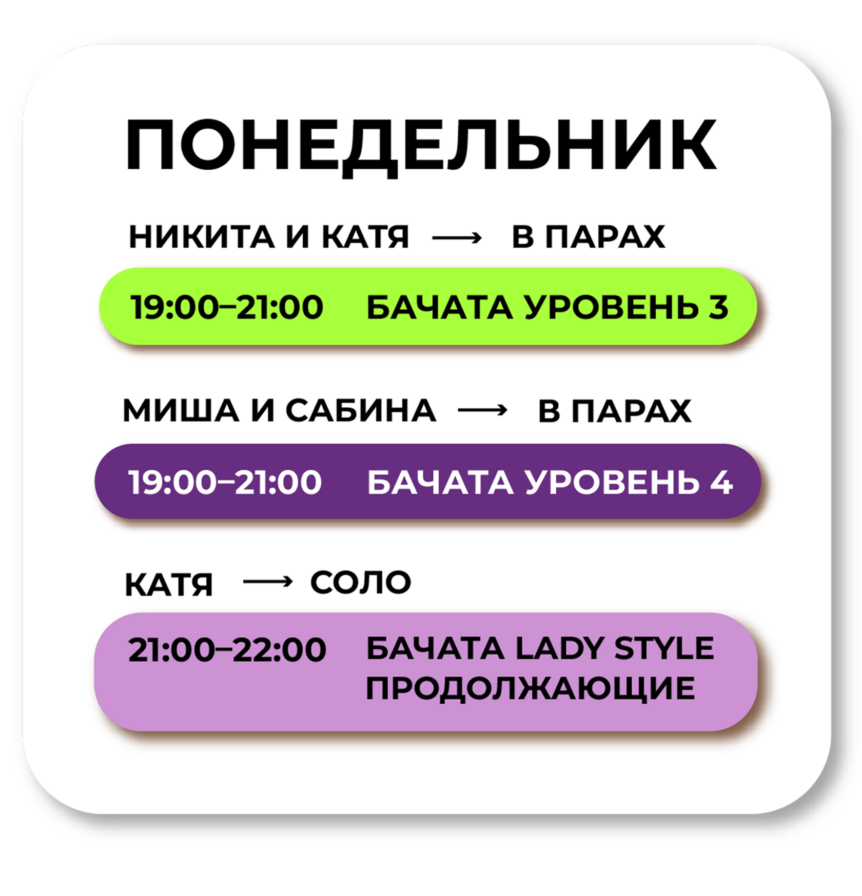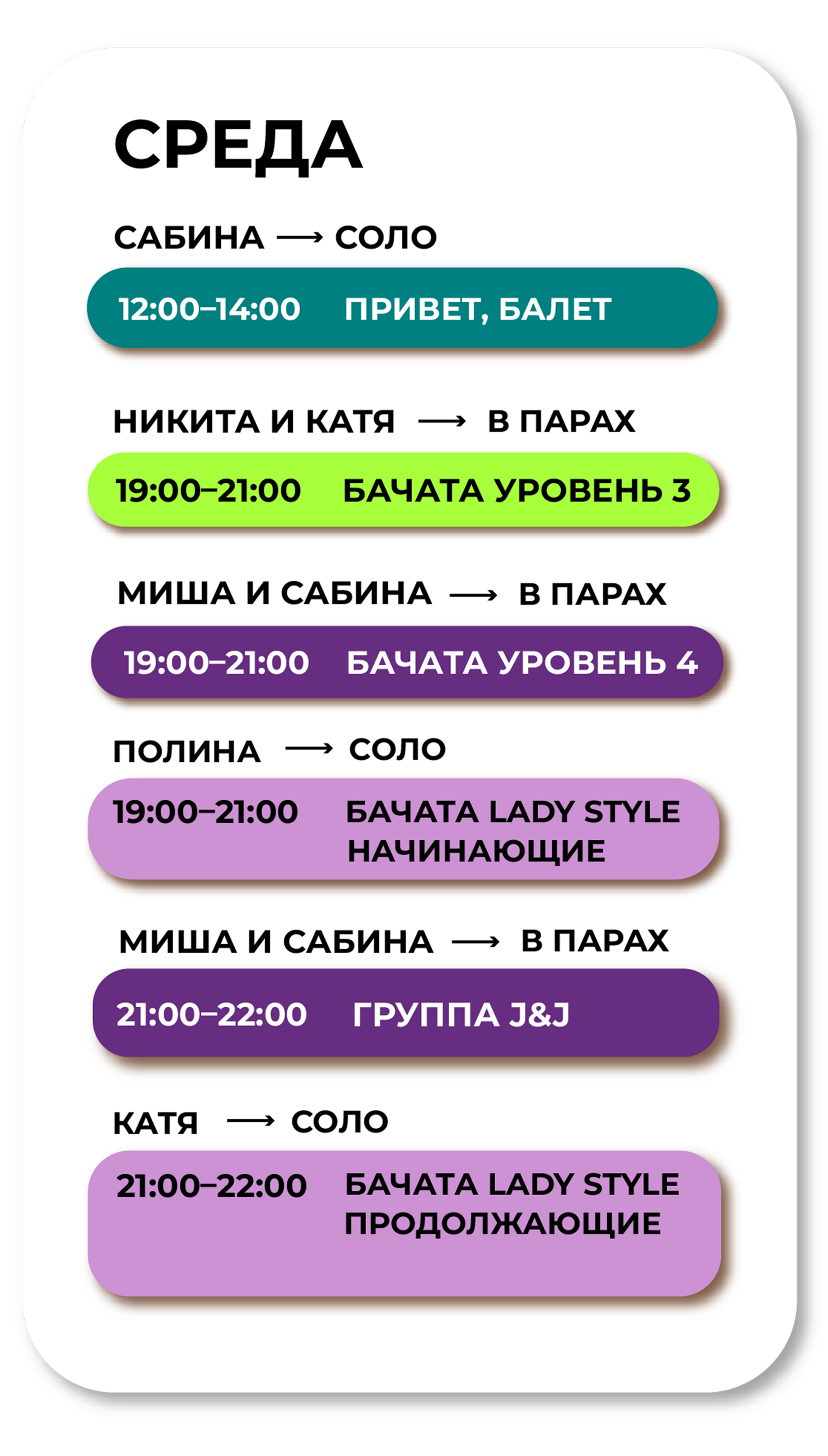Занимаюсь в Bachata Caliente уже год и все очень нравится, это и очень опытные преподаватели (чемпионы России, Казахстана и вице чемпионы мира - данные титулы говорят за себя) занятия, с которыми проходят в очень позитивной и продуктивной атмосфере, также из плюсов это и расположение прямо у метро лубянка, так и сами залы очень красивые и с шикарными панорамными видами на центр Москвы (рилсы записывать самое то) И стоит выделить проводимые школой сезонные вечеринки, которые я никогда не пропускаю)